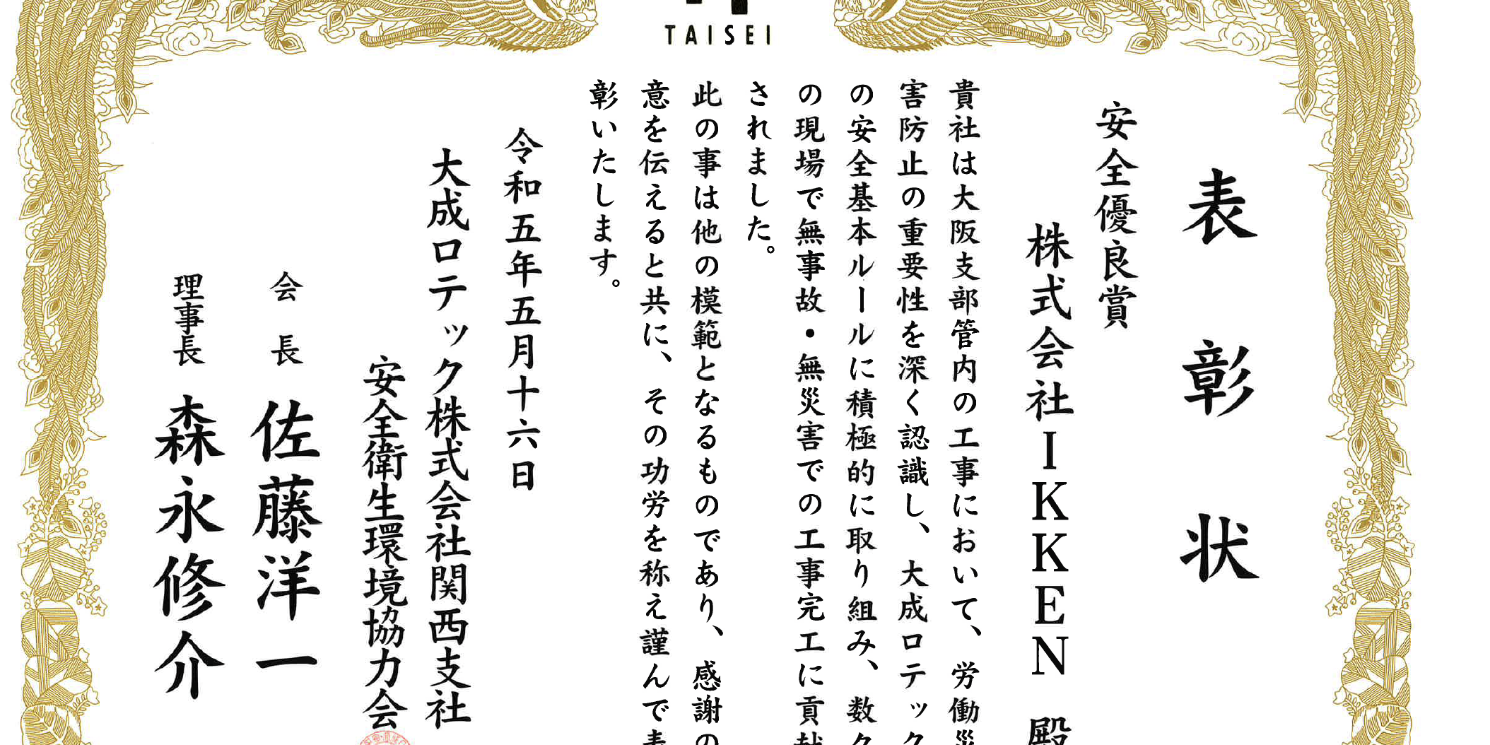 5月172023建設事業 大成ロテック株式会社様より令和5年度の安全優良企業として当社を表彰していただきました 表彰状を拡大して表示する場合はクリックしてください。 カテゴリー: 建設事業IKKENから2023年5月17日 Share this post つぶやきTwitter で共有 ピンするPinterest で共有 Facebook で共有Facebook で共有 LinkedIn で共有LinkedIn で共有 投稿ナビゲーション前へ前の投稿:某コーヒーショップ高砂小松原店次へ次の投稿:某コーヒーショップ大和高田店From the Same Categoryマツゲン 泉北高倉台店 新築工事2025年8月8日大阪・関西万博 水と空気のスペクタクルショー「アオと夜の虹のパレード」メインオブジェ新築工事2025年4月26日コーナン枚方加賢緑町店内装工事2025年4月25日某コーヒーショップ西宮大島店2025年4月25日JRA阪神競馬場キッズガーデン整備工事2025年4月25日千代田台共同住宅新築工事2024年11月18日